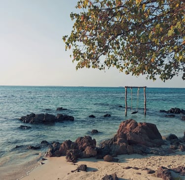 Dari Bukit Love, perjalanan dilanjut ke Pantai Tanjung Gelam — pantai dengan pasir putih halus dan air yang jernih banget. Di sini bisa foto-foto, main air dan pasir, atau sekadar duduk sambil ngemil jajanan lokal yang banyak dijual warga sekitar.